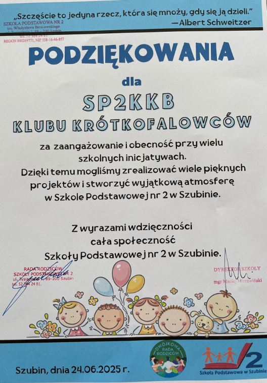 W piątek 27 czerwca 2025 na uroczystej gali podczas zakończenia roku szkolnego otrzymaliśmy z rąk władz Szkoły Podstawowej nr 2 w Szubinie podziękowania za udział w życiu szkoły.