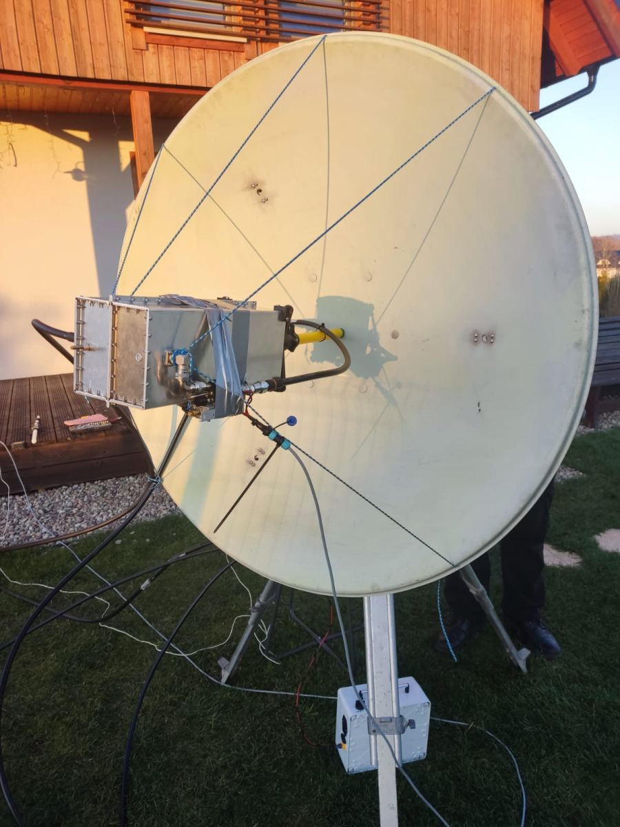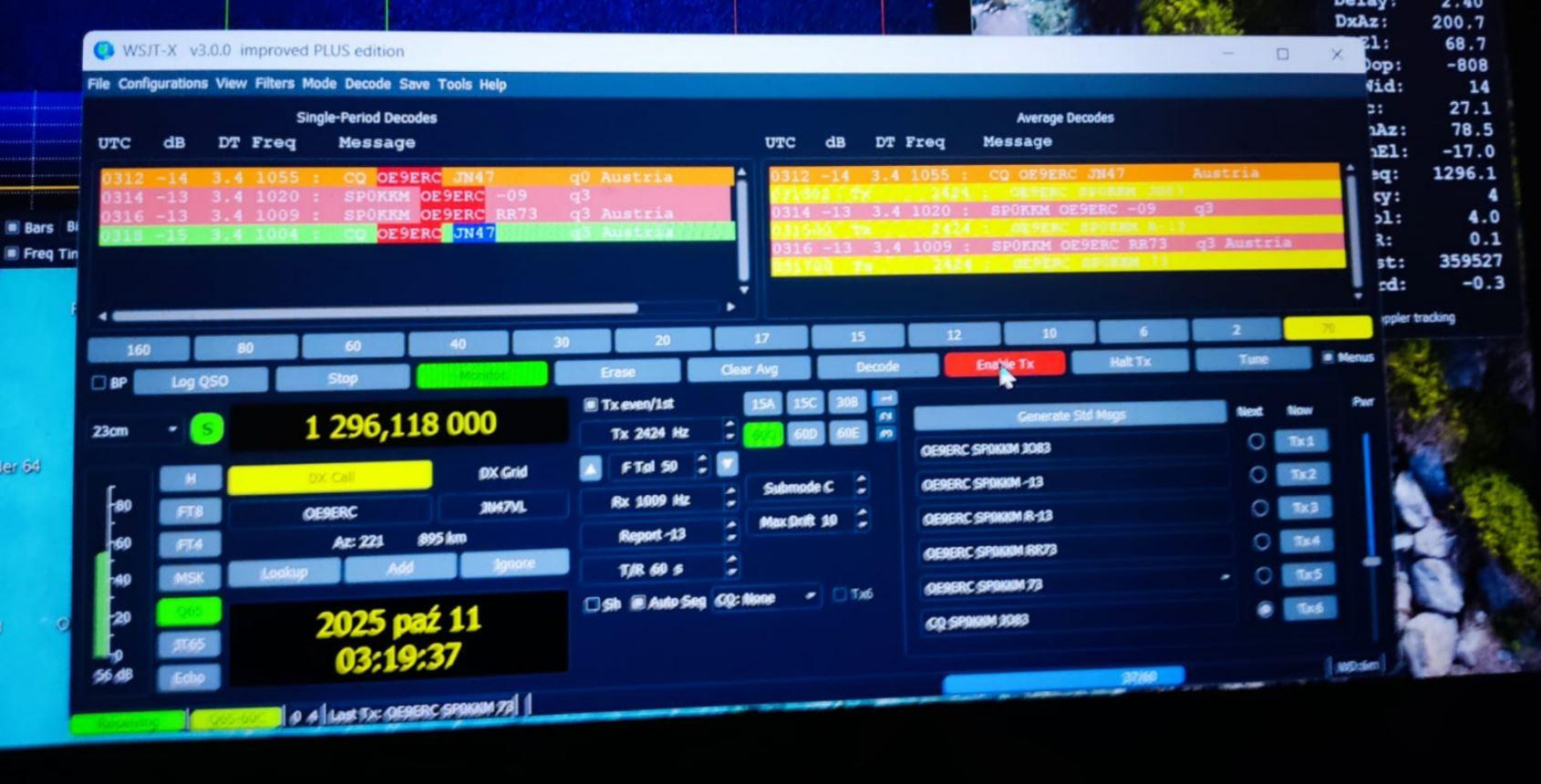 Parabola 1,2 m oświetlacz wg OK1DFC, LNA SM5GDX, PA 500 W, TRX IC-9700. Korzystaliśmy z oprogramowania WSJT-X Joe K1JT.