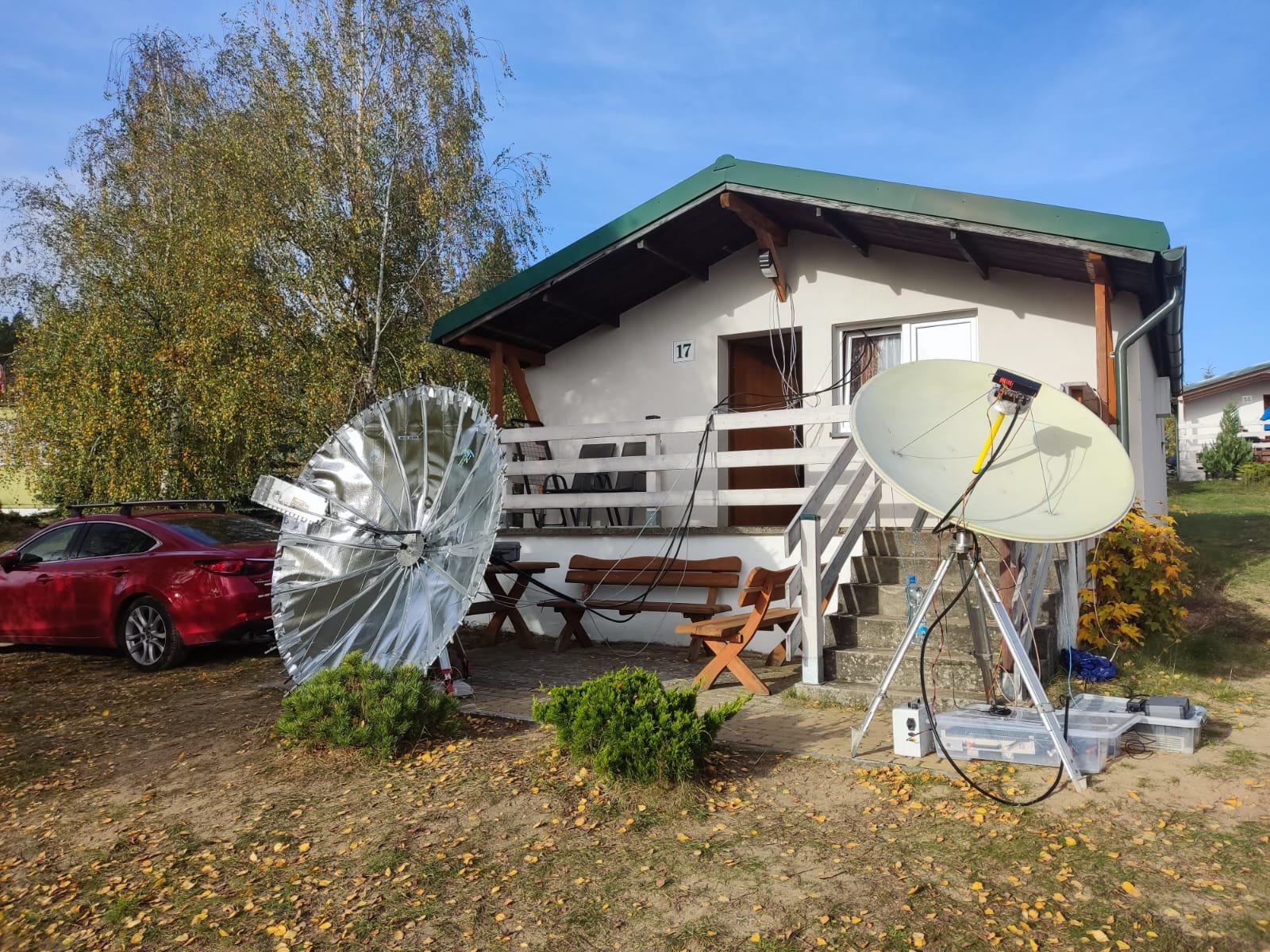 Pierwsza z parabolą parasolkową 2m klejoną na miejscu na statywie i rotorze wykonanymi przez Marka SP4ELF. Oświetlacz wg OK1DFC też w wykonaniu Marka i z jego LNA. Wzmacniacz 500 W przywiózł Marcel SP2HMR. TRX IC-9700 Jurka SP2GUB.